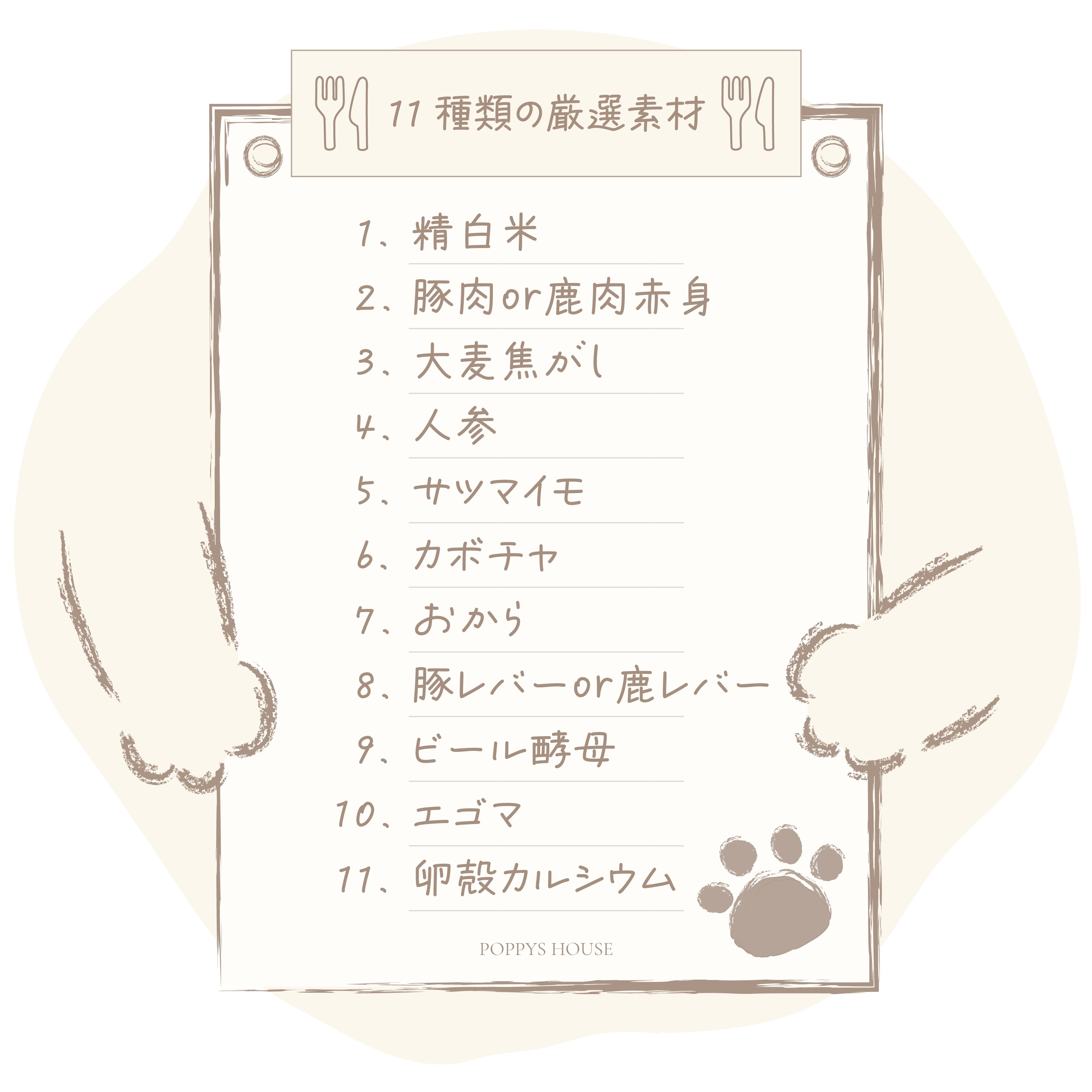 原材料 |精白米・豚肉赤身・大麦焦がし・人参・サツマイモ・カボチャ・おから・豚レバー・ビール酵母・エゴマ・卵殻カルシウム